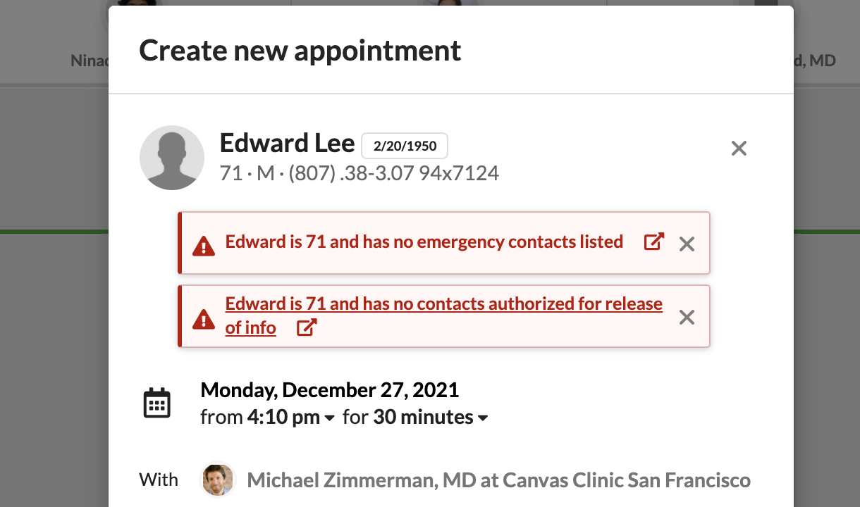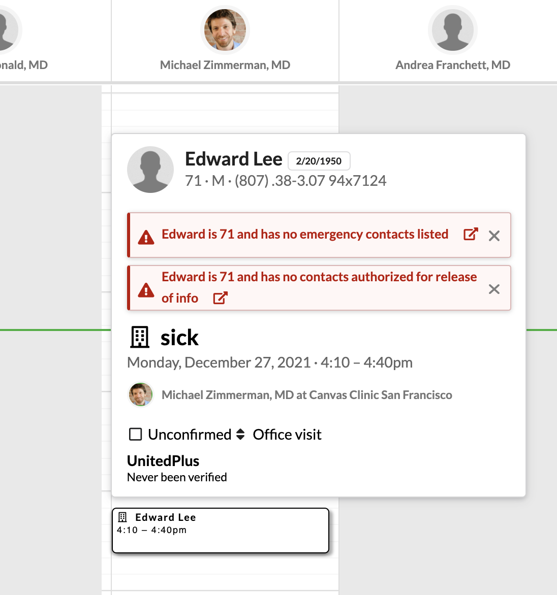 This will appear when you select a patient during the scheduling of an appointment on the calendar view